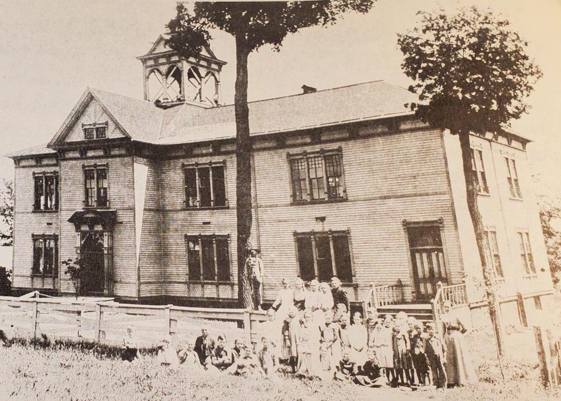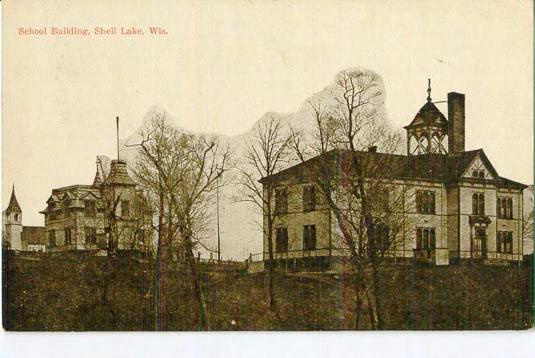 In December of 1881 school was held in a small log building near the shore of Shell Lake.This building initially served as a trading post and was constructed by Leander “Dan” EllwoodThomas. It was also the first building in what was to become theTown of Shell Lake in 1890.Twenty-five students attended school the first year.After two years of schooling in the converted trading post a two room school was constructed where the Erika Quam MemorialTheater is today at 605 1st Street.The Shell Lake Lumber Company then built another school in the company’s pasture for the “mill-row children” or for children that lived in lumber company sponsored housing, constructed in a row near the mill. (Stouffer 1961, P.19, 69, 70 & 116)