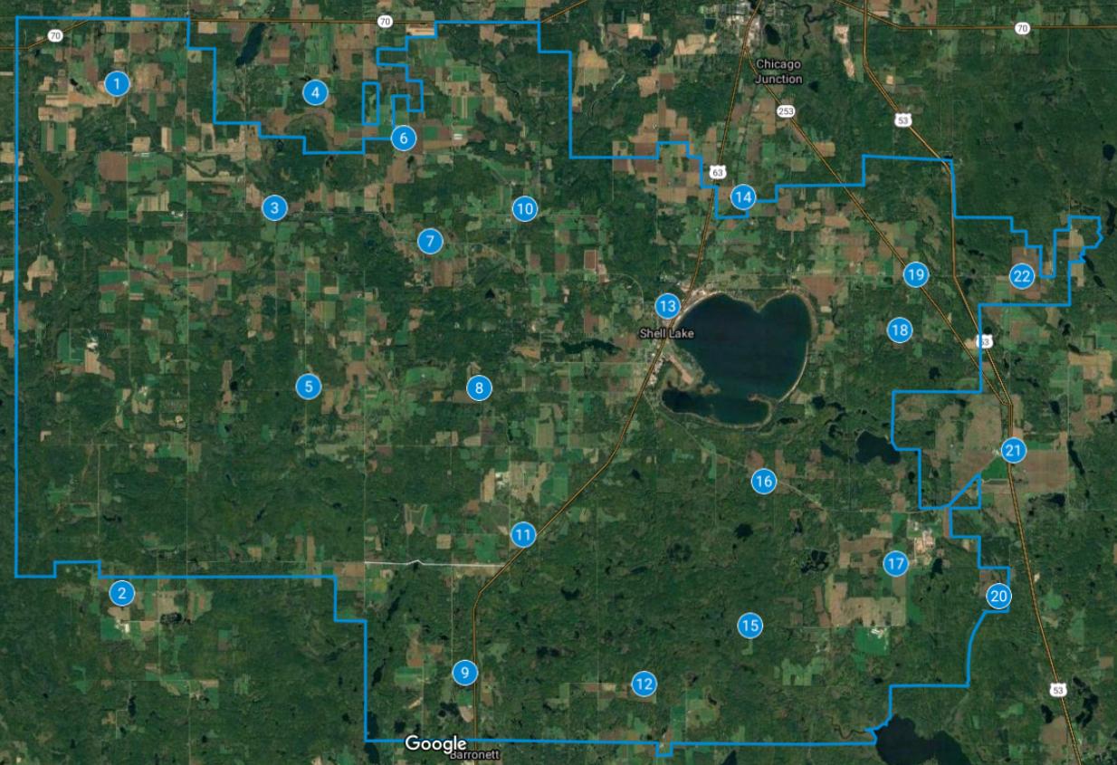Shell LakeArea Schools and School District Boundary | Below is a list of 22 country schools that at one time were operating in and around Shell Lake from 1881 through 2021.The present day school district boundary is also shown.This circuitous boundary reflects the differing opinions on where residents desired their children to attend school in the mid 1950s when district boundaries were first established. (Wisconsin Department of Public Instruction and State Cartographer's Office 2021)