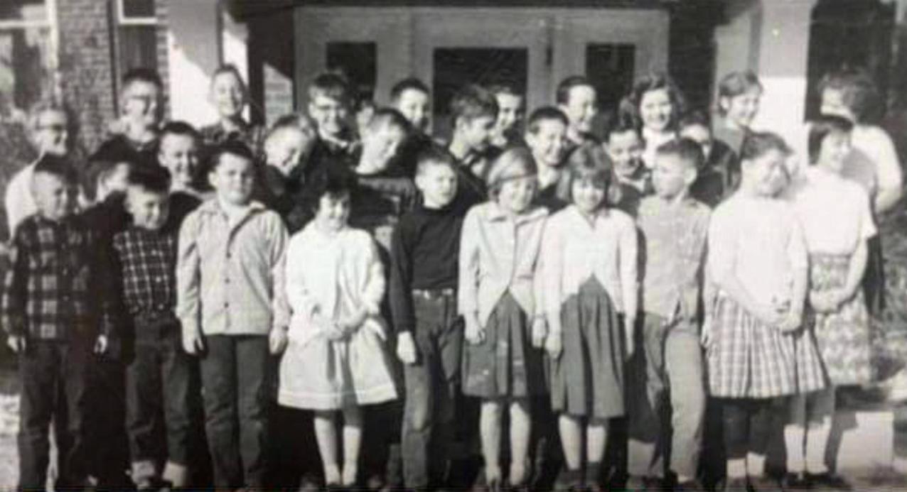 Brickyard School Students 1961 - 1962| Twenty-seven students in grades 6 through 8 were present for this picture on the front steps of Brickyard during the 1961-1962 school year.These students would be scheduled for high school graduation in 1966, 1967 and 1968. Some of the students identified are: Front row L- R Larry Fogelberg, Gary Fogelberg, John Regenauer, Verdell Erickson, Bob Pederson, Nan Stodola, Renee Stodola,Adolph Kirkreit, Susan Regenauer, Jackie Glessing. (Facebook Group,You know you're from Shell Lake if... Posted May 1, 2021)