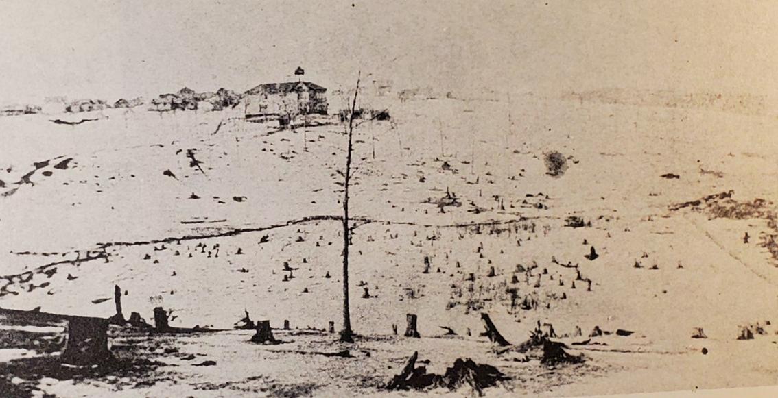 1885 School | The photos at right, and below show the school that followed the three schools mentioned above.This two story, wooden frame building was constructed in 1885 and was located at the intersection of where 1st Street and 8thAvenue are today.This school is reported to have cost $5,000 and had four apartments in it.The photo below shows an earlier picture of the school on the edge of the “hollow”, surrounded by a sea of stumps left from clear cutting the forest by the Shell Lake Lumber Company. Other photos from 1885 to 1915 show this school being constructed in three phases. These two pictures depict the central first phase.