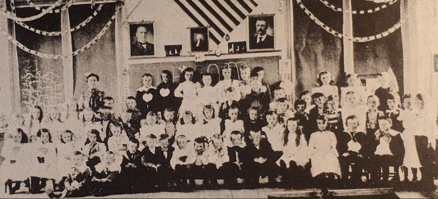 1902 | Below is another photo of Ms Nell Rafferty with students in 1902. Based on the age of the students this photo was also likely taken in the grade school that was completed in 1890 shown on page 3. Presidential photos show President William McKinley and Vice PresidentTheodore Rooosevelt.This 1902 photo was taken just after the assasination of President McKinley and Vice President Roosevelt ascending to the office of the President in 1901. (Winton et al. 1980, P. 30)