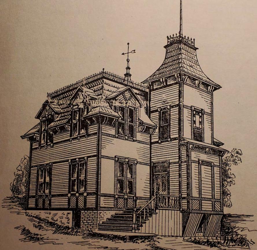 Constructed in 1890 | Local officials selected this impressive architectural rendering for the final design of the grade school that was constructed in 1890 near the 1885 school shown on the previous page. Builders followed this design to perfection. The quality craftsmanship is evident when you compare this drawing to the photo of the grade school in the photo below and at the bottom of page 6. (Hoar 1968, P. 99)
