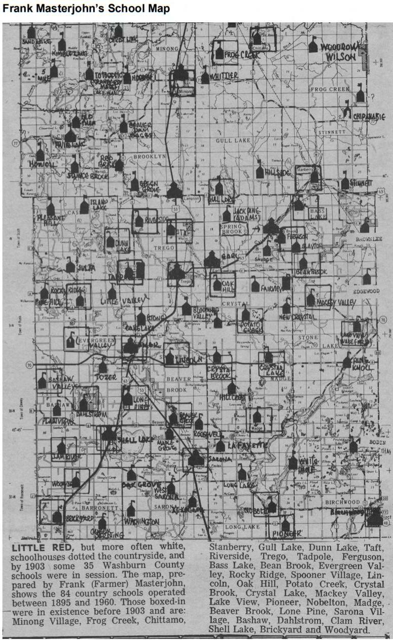From the late 1800s until the early 1960s one or two room country school houses serving multiple grades was the norm for education in Washburn County. The map on the right prepared by Frank “Farmer '' Masterjohn, a teacher at the Springbrook School shows the location of 84 country schools. By 1903 this number dropped to 35 country schools in the county.The schools that are boxed in operated on or before 1903 (Tarr and Masterjohn 2019). Students living near these schools gradually enrolled into the Shell Lake, Spooner, Siren, Rice Lake, Cumberland, Birchwood and Minong school districts. Shell Lake’s grade school addition in the early 1950s and the 1959 new elementary school were constructed to accommodate some of the students that would have gone to these country schools.Anumber of these school buildings still exist with some transitioning to homes, museums, community centers, town halls, or businesses.
