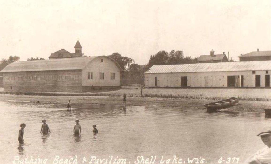 The photos at right show the pavilion that was constructed by the Francis Bergin and Paul Neiman American Legion Post No. 225 in 1924.The pavilion was originally 50 ft. x 100 ft. in size. It was used for high school basketball prior to the gymnasium being built next to the high school in the early 1940s. It was also used for dances, roller skating and boat storage during its existence. It was leased by the American Legion to the Shell Lake Civic Club, who held fund raising events that went towards community improvements.The pavilion was later sold to the Village of Shell Lake for $1.00.The village then leased the property to the Legion for $1.00 a year for 99 years. During the time of this lease the Village was awarded federal funding from the Works Projects Administration (W.P.A) in the late 1930s to undertake renovations to the pavilion.The pavilion was razed in the mid 1970s as construction of the Community Center began at its location in 1978. (Stouffer, 1961, P. 82, 83, 160, 198; Facebook: Old School Rice Lake Page, Posted 01/25/2014; Facebook Group, You know you're from Shell