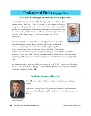 Professional Firms Employee News GPI Adds Landscape Architect to Local Operations Greenman-Pedersen, Inc., welcomes John Reddington, RLA to its Western New York operations. John has 19 years of experience in site planning and project management, bringing a wide range of project experience to GPI. He earned his bachelor of science in business administration degree from John Carroll University in Cleveland Ohio, and his master of landscape architecture degree from State University of New York, College of Environmental Science and Forestry (SUNY-ESF). Prior to joining GPI, he was involved in a variety of projects in the Upstate New John Reddington, RLA York region, including campus design, waterfront improvement projects and resort and hotel developments; as well as residential development, golf course facility improvements, and municipal master planning and design. Sustainability has been a major component of John’s work throughout the past decade, as he has consulted on numerous LEED projects in the University, resort and municipal business sectors. He has provided site planning and landscape architectural consulting services to six SUNY campuses over the past 3 ½ years. Mr. Reddington adds a landscape architecture component to GPI’s WNY projects and will support business development efforts in the region. John will be based in Rochester, supporting the Buffalo, Jamestown, and Rochester offices. q