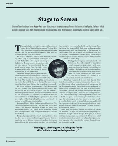 he original plan was to perform a special event show at the Lockn’ Festival in Arrington, Virginia. The idea was to have the band perform a Tedeschi Trucks Band set one day, and a special collaborative show with another well-known artist the other day. We reached out to Joe Cocker to front the band, performing a Mad Dogs & Englishmen set. Getting Joe to sit in with the band for a few songs is something we had tried to do on a number of occasions, with no prior success. We were then told that we would have an answer from the Cocker camp in a short while. A few months later, it was announced that he had passed away. The band, manager, festival promoter and I decided to move ahead with the plan as a tribute to Joe Cocker, with the idea of finding someone to take his place. After months of searching high and low, there was no one that could do that so we then decided to use various ‘guests’ and have Susan Tedeschi sing some of the songs as well. We began enlisting various guests – Chris Robinson of the Black Crowes, Dave Mason to sing Feelin’ Alright, Warren Haynes, Jon Bell from Widespread Panic, etc. However, when the promoter asked if it would be alright to reach out to Leon Russell, who had supported Tedeschi Trucks Band on occasion that’s when the floodgates began to open. I was and am a big fan of Mad Dogs & Englishmen and Leon Russell – it seemed we could create something big. I suggested he see if Rita Coolidge was still working, if he could find Claudia Lennear, who I had heard was retired, and contact Chris Stainton, who Derek [Trucks] had played with when he toured with Eric Clapton. Before we knew it, we had 12 of the original Mad Dogs, along with the 12-piece Tedeschi Trucks Band! I originally suggested to the band’s manager that we film the show just in case something magical happens. Unfortunately, the cost of doing so on that scale and on short notice was prohibitive. We scrambled to try and get it organised and