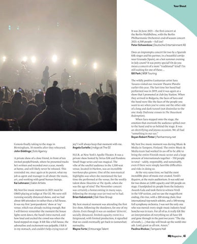 joy! I will always keep that moment with me. Angela Curiello | indigo at The O2 H.E.R. at New York’s Apollo Theater. It was a private show hosted by Sirius XM and Pandora Small Stage series and was magical. The vibe of the soulful audience in the 1,500-seat venue, located in Harlem, was an incredible two-hour-plus groove. One of the non-musical highlights was when she mentioned the last time she performed at the venue, for the weekly talent show Showtime at The Apollo, when she was the age of nine! The November concert was certainly a homecoming in many ways, following the strange year (or two) we’ve had. Brian Kabatznick | Oak View Group My best musical moment was attending the first live show, following the shutdown, for one of my clients. Even though it was an outdoor ‘drive-in’, socially distanced, limited-capacity event in a fairground, with limited production, it signalled that we could eventually get back to (somewhat) normality. Wayne Forte | Entourage Talent