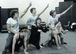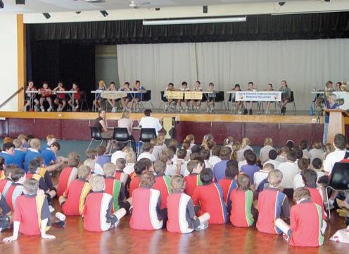 and students of the Primary School visited. Students: Back - Nick, Charlie, Tom H, Tom M. Front - Tim, Alex and Angus. Others are audience.