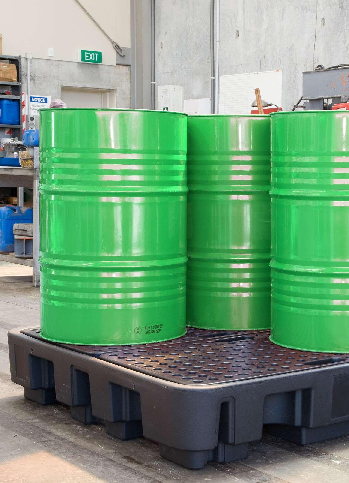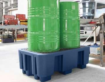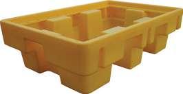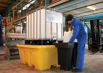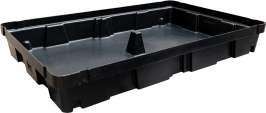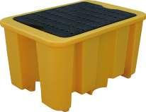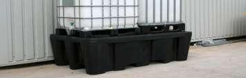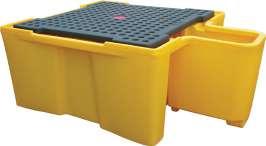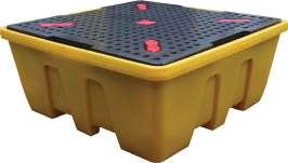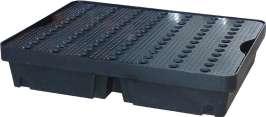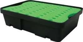 Gamma di vasche di raccolta per 1, 2 e 4 fusti con capacità da 230 a 485 litri- Ideali per la raccolta statica in fabbriche,magazzini, fattorie, garages ecc - Griglia duratura ed amovibile - Testate per resistenza idrostatica e al caricoGriglia con inserti ergonomici di presa e fori per ispezione e/o inserimento pompa - Compatibili con quasi tutti i carrelli elevatori a forche anche con prolunghe - Togliere i fusti e i recipianti e svuotare la vasca prima di muoverla - Griglia standard nel colore nero - Accessori pagg 20-21
