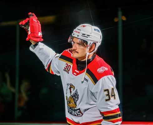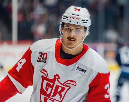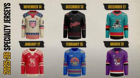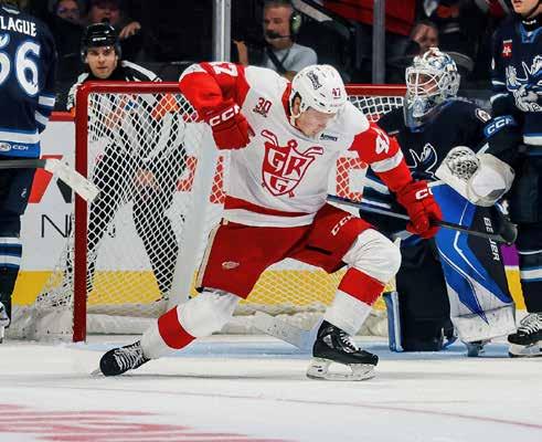 Trey Fix-Wolansky, a name familiar to Griffins fans, did not return to Cleveland this season, as he signed a oneyear deal with the New York Rangers back in July. Entering this season, Fix-Wolansky had 259 points (112-147— 259) in 289 regular-season AHL outings. All time against Grand Rapids, Fix-Wolansky has 33 points (13-20—33) in 33 games, which includes 27 points (9-18—27) in his last 21 meetings against the Griffins. Another familiar name, goaltender Jet Greaves, who was named to the 2024-25 AHL Top Prospects Team, is now a full-time NHL player with Columbus. All time against the Griffins from 2021-25, Greaves posted a 10-5-2 record with a 2.57 goals-against average and a .913 save percentage.