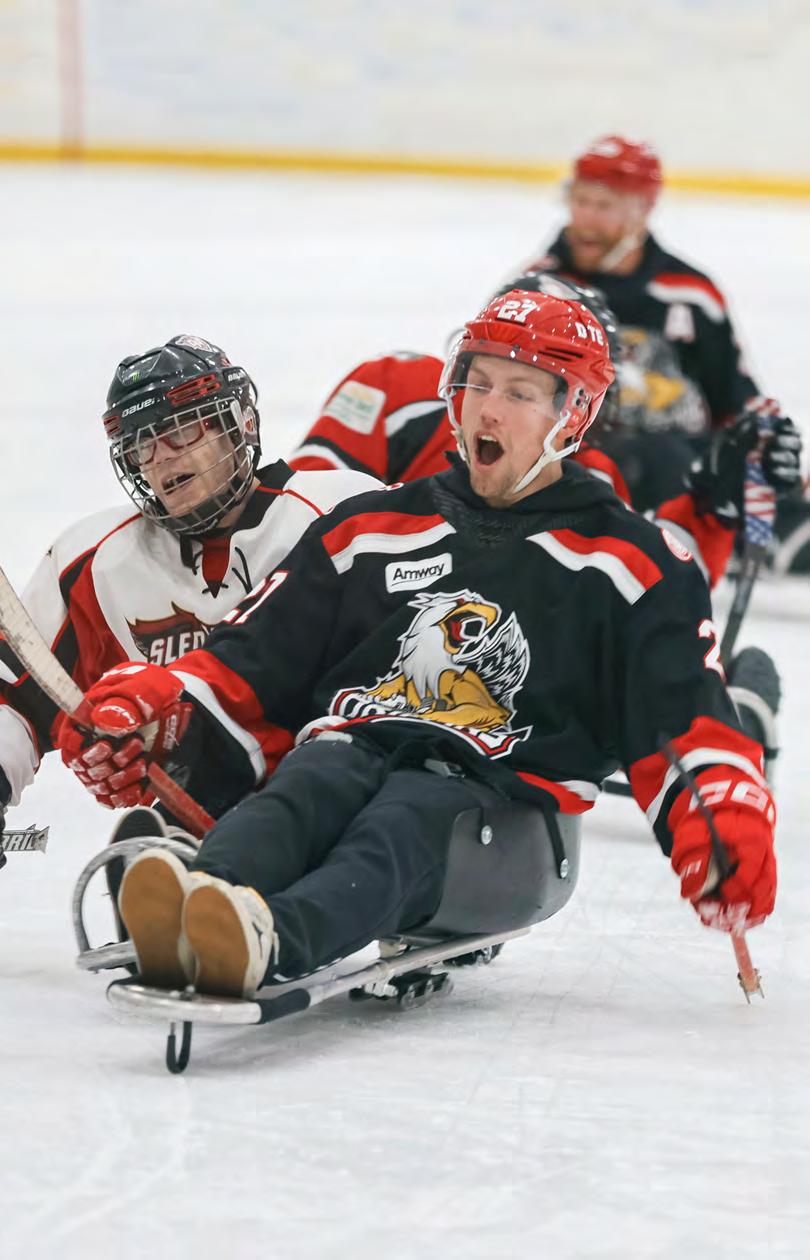 Austin Czarnik and his Griffins teammates had reason to smile when they participated in the 16th annual Griffins & Sled Wings Game at Griff’s Icehouse at Belknap Park on Feb. 8, 2023. Proceeds from the sled hockey game benefitted the Grand Rapids Sled Wings and the Griffins Youth Foundation.