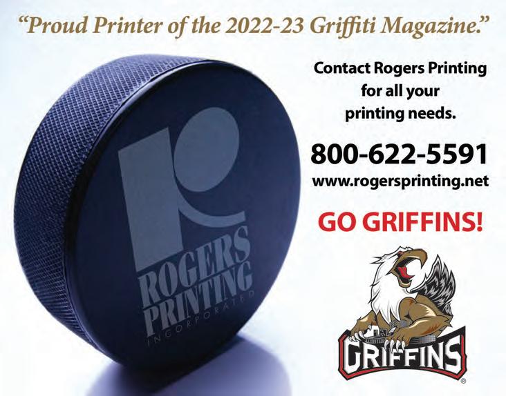 Griffiti magazine is published four times a year by the Grand Rapids Griffins, Van Andel Arena, 130 W. Fulton St., Grand Rapids, MI 49503. All rights reserved. Reproduction in whole or in part without permission is prohibited. All contents ©2023 Grand Rapids Griffins. For advertising information, contact Griffins Sales & Marketing, (616) 774-4585; fax (616) 336-5464. Unsolicited manuscripts and other materials will not be returned. 28 34 42