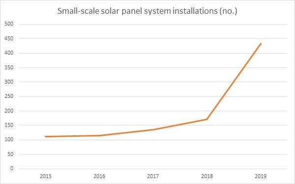 The Griffith LGA has seen a dramatic increase in the number of solar panel systems being installed over the past five years and Council leads by example having installed solar panels on most buildings and supports and promotes the use of alternative energy sources. Below: Data from Australian Bureau of Statistics