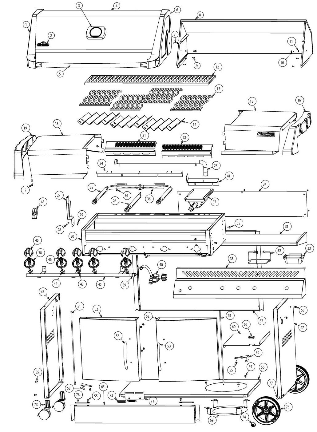 n345-0006gasslang / gastoevoerslang FR x n345-0004gasslang / gastoevoerslang DE x 41n080-0189steun infrarood brander / Träger des Infrarotbrenners x 42n432-0013buis verdeelstuk met beugels / Verteilerrohr mit Halterung x 43n725-0007klep achterste brander / Ventil, hinterer Brenner x n255-0006achterste brander, voll. fitting – uiteinde klep / Ventilansxhluss, hinterer Brenner x n720-0045toevoerbuis achterste brander / Sufuhrrohr, hinterer Brenner x n455-0002/ n455-0024 opening achterste brander (nr. 56) / Düse, hinter brenner (#58) DE x 44n725-0009klep hoofdbrander / Ventil, Hauptbrenner x n455-0013 / n455-0023 nr.61 opening hoofdbrander / Düse, haupt brenner (#65) DE x 45n380-0015bedieningsknop, hoofdbrander / Einstellknopf, Hauptbrenner x n380-0015rbedieningsknop, hoofdbrander infrarood / Einstellknopf, Hauptbrenner Infrarot x 46n630-0003ring opsluitveer / Haltefeder für Deckring x 47n475-0222gkarbehuizing, links/rechts / Wagenumfassung, links / rechts x 48n357-0017elektronische ontsteking, 5 vonken / Elektronische Zündung,5-Funken-Zünder x n240-0016elektrode, buisbrander 11” / Rohrbrenner-Elektrode 11” x n240-0020elektrode, buisbrander 18.5” / Rohrbrenner-Elektrode 18.5” x n240-0021elektrode, buisbrander 26” / Rohrbrenner-Elektrode 26” x n240-0025infrarood brander, elektrode / Infrarotbrenner-Elektrode x n750-0018elektrodedraad / Elektrodendraht x n200-0070infrarood brander, elektrode, deksel / Abdeckung der Infrarotbrenner-Elektrode x n350-0054behuizing – hoofdbrander / Sammelbehälter - Hauptbrenner x 51n555-0012scharnierstang deur / Türscharnierstange x 52n010-0559ssdeur karretje / Wagentür x n010-0559zbrons deur karretje / Wagentür Bronze x 53n325-0049deurhandgreep / Türgriff x n570-00291/4-20 x 3/8” schroef / Schraube 1/4-20 x 3/8 Zoll x n735-00021/4” sluitring / Sicherungsscheibe, 1/4 Zoll x 55n570-0026#14 x 1/2” schroef / Schraube, #14 x 1/2 Zoll x 56n590-0153gonderste rek / Bodenregal x 57n475-0280gachterste paneel - kar / Wagenrückwand x 58n080-0130pbeugel deurstuiter - links / Türstopper - links x 59n080-0166pbeugel deurstuiter - rechts / Türstopper - rechts x 60n585-0025phittescherm / Hitzeschild x 62n105-0002bus klikverbinding / Einsetzbuchse x 65n525-0008gdwarsbalk vooraan/achteraan / Querträger hinten / vorn x 69n010-0491psteun flesring / Flaschenmontageklammern x 71n080-0165pbeugel, magneet / Magnethalter x 72n430-0002magnetische sluiting / Magnetverschluss x 73n130-0010zwenkwieltje / Rolle x 74n450-0023asdop / Achsemutter x 76n745-0007wiel / Rad x 77n015-0004as / Achse x 78n080-0193pbeugel deurstuiter / Türstopper x