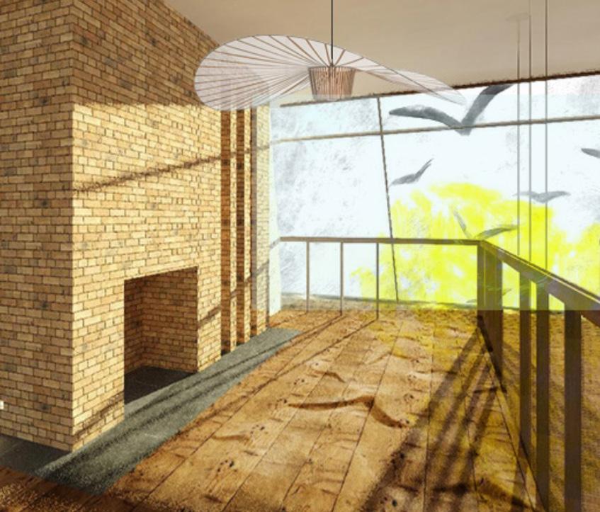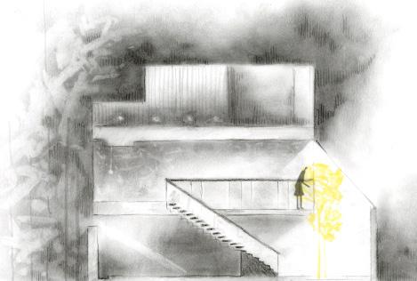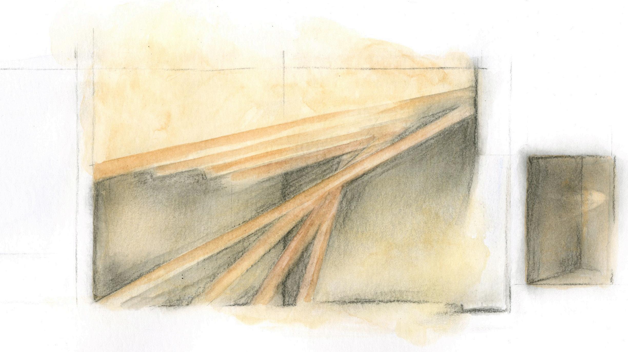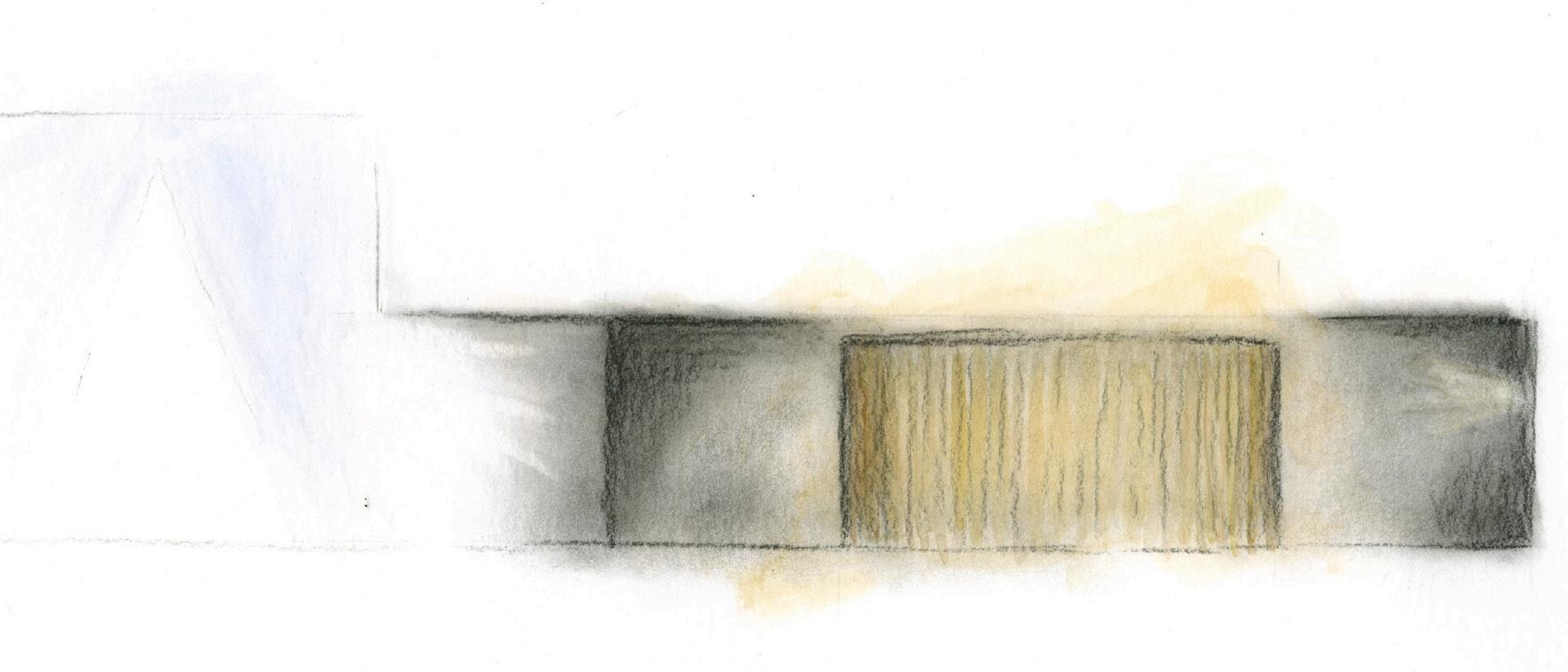 Charcoal and water section drawing displaying the interconnection of floors and light quality.
