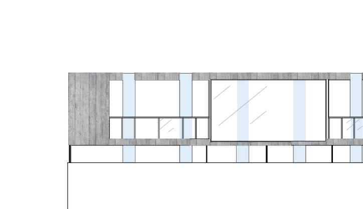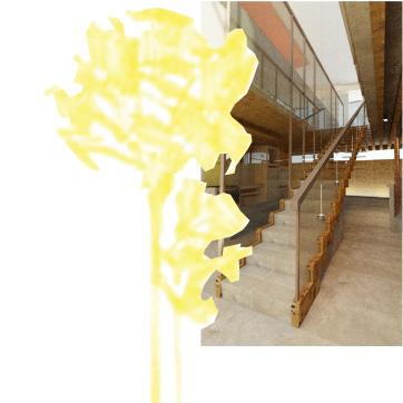 Structural columns extend to the second floor and become wrapped in glass, inspired by a poem by M. Oliver, quoting trees as "pillars of light".