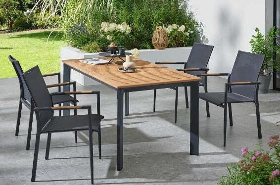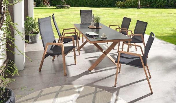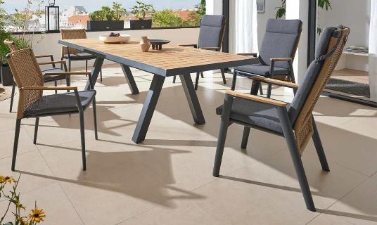 Hier trifft Aluminium auf Teakholz. Beim Dining-Move-Sessel sorgt die verstellbare Rückenlehne für zusätzlichen Komfort. Der rechteckige Ausziehtisch „Tirana“ kann auf bis zu 260 cm Breite ausgezogen werden und bietet somit genug Platz für max. 10 Personen. Gestell und Armlehnen aus Aluminium, pulverbeschichtet, matt anthrazit, Flächen aus Gardino®-Geflecht, rund, natur, Armlehnen-Onlay und Tischplatte, ca. 10 mm stark, Teakholz, geölt, natur. Hochwertige Kissen aus Polypropylen (280 g/m²), grau. Stapelsessel „Roma“, ca. B 62 x T 56,5 x H 84 cm, Dining-Move-Sessel „Roma“, B 83 x H 108 x T 60,5 cm, Ausziehtisch „Tirana“, ca. B 200/260 x H 77 x T 100 cm.