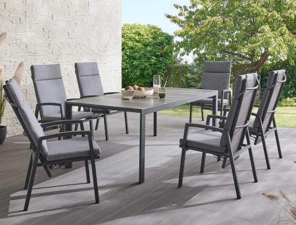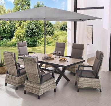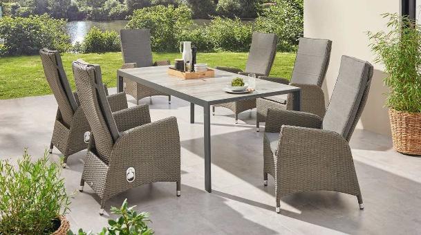 Erhältlich als 3-teiliges oder 7-teiliges Set oder nur den Dining-Sessel einzeln. Aluminiumgestell, anthrazit, Kunststoffgeflecht, grau, Rückenlehne stufenlos verstellbar. 3-teilig bestehend aus 2 x Sessel, ca. B 59 x H 109 x T 66 cm, 1 x Tisch mit Keramikplatten, ca. B 100 x H 74 x T 100 cm, Art.-Nr. 45763280, 649.- €