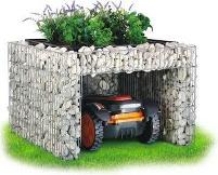4| Mährobotergarage mit Pflanzschale Bausatz. Zink-Aluminium verzinkt. Stahldraht 4/3 mm, Maschenweite ca. 2,5 x 10 cm. Empfohlene Steinkörnung ca. 2,5 – 6 cm, Steinbedarf ca. 175 kg. Ca. B 85 x T 95 x H 53 cm. Ohne Befüllung. Art.-Nr. 45315352