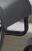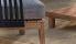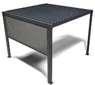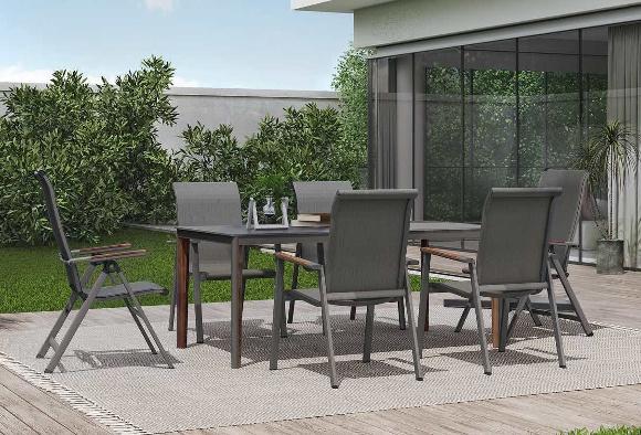 Aluminiumgestell, Textilen-Bespannung, Farbe „iron grey“, Armlehnen und Dekorelement an Tischbeinen in Mahagoni-Optik, HPL-Tischplatte.