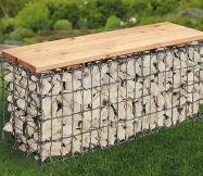 Bausatz. Zink-Aluminium verzinkt, Maschenweite ca. 5 x 10 cm. Sitzfläche aus stabilem und hochwertigem Douglasienholz. Empfohlene Steinkörnung ab ca. 5 cm. Steinbedarf ca. 190 kg. Ca. B 100 x T 30 x H 46 cm. Ohne Befüllung. Art.-Nr. 396260