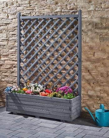 Zink-Aluminium verzinkt, Maschenweite ca. 3,3 x 15 cm, integrierte Tür aus anthrazitfarbenem HPL und Pflanzschale aus schwarzem Kunststoff. Empfohlene Steinkörnung ab ca. 3,2 cm. Ohne Befüllung.