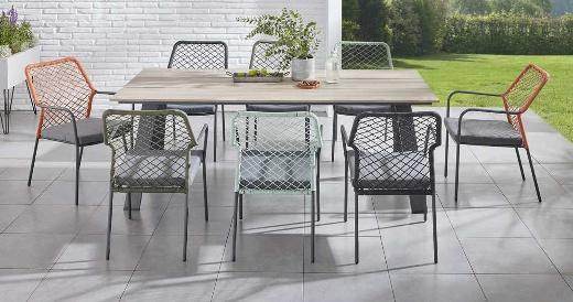 Für Garten und Terrasse. Stapelbare Sessel mit Rope-Bespannung und Stahlgestell, Tisch mit Aluminiumgestell. In verschiedenen Farben erhältlich. Inkl. Sitzkissen.