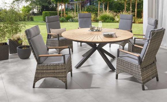 Die Dining-Serie „Kanto“ kombiniert hochwertige Materialien und modernes Design zu einem robusten und gleichzeitig praktischen Dining-Set. Das Highlight ist eine drehbare kleine Tischplatte in der Mitte des Tisches, die jedem Gast einen einfachen Zugriff auf dort platzierte Speisen, Getränke und vieles mehr ermöglicht. Aluminiumgestell, Holzoptik. Dining-Sessel „Kanto“, Geflecht, natur-meliert, ca. B 67 x H 80 x T 56 cm, inkl. Kissen, Art.-Nr. 45683807, 119.- € Tisch „Kanto“ Keramikglas-Tischplatte, grau, ca. Ø 159 x H 76 cm, Art.-Nr. 45683806, 699.- €