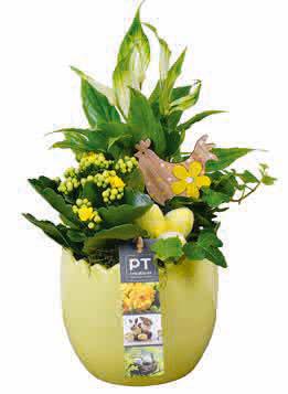 3 Pflanzen und Deko im 14-cm-Keramikgefäß, gelb. Art.-Nr. 45858444