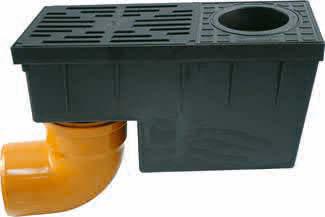 Senkrechter Ablaufanschluss DN 110, für Fallrohre DN 75–110, temperaturbeständiger Kunststoff, mit Laubfangkorb, Geruchsverschluss und Gitterrost.