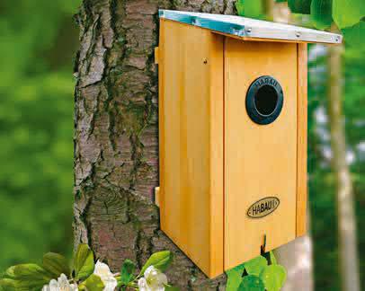Auswechselbare Einfluglöcher aus Kunststoff mit ca. Ø 28 und 32 mm, verzinktes Blechdach, für versch. Vogelarten. Ca. B 12 x H 25 x T 12 cm.
