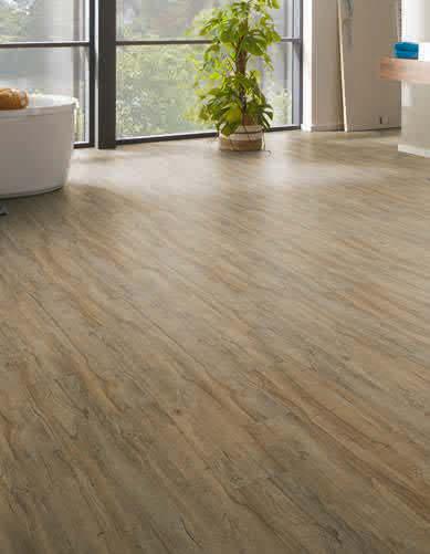 Verlegung bis 400 m² ohne Dehnungsfuge, Landhausdielenoptik, Holznachbildung, mit Klickverbindung, geringe Aufbauhöhe, für Fußbodenheizung geeignet, Dekor „Eiche Pfälzer“.