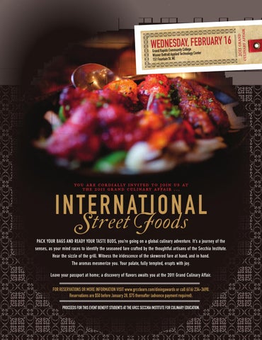 PACK YOUR BAGS AND READY YOUR TASTE BUDS, you’re going on a global culinary adventure. It’s a journey of the senses, as your mind races to identify the seasoned fare crafted by the thoughtful artisans of the Secchia Institute. Hear the sizzle of the grill. Witness the iridescence of the skewered fare at hand, and in hand. The aromas mesmerize you. Your palate, fully tempted, erupts with joy. Leave your passport at home; a discovery of flavors awaits you at the 2011 Grand Culinary Affair. FOR RESERVATIONS OR MORE INFORMATION VISIT www.grcclearn.com/diningawards or call (616) 234-3690. Reservations are $50 before January 28, $75 thereafter (advance payment required). PROCEEDS FOR THIS EVENT BENEFIT STUDENTS AT THE GRCC SECCHIA INSTITUTE FOR CULINARY EDUCATION.