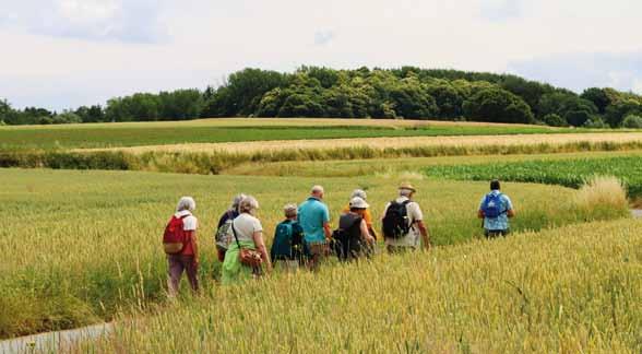 alles over in brouwerij 3 Fonteinen. Niet het brouwproces, maar de ‘stekerij’ krijgen we te zien. Daar worden oude en nieuwe lambik oordeelkundig gemengd en gaan samen op de fles voor verdere rijping tot geus. Je moet liefhebber zijn van het zurige brouwsel, maar het is wel een ideale dorstlesser op zonnige zomerdagen. Tussen Sint-Kwintens en Sint Martens Lennik ligt een zachte vallei die uitnodigt tot wandelen. Groenschepen Hendrik Schoukens leidt ons rond in Sint-Martens. Dit is echt hartje Pajottenland. In de tuin van