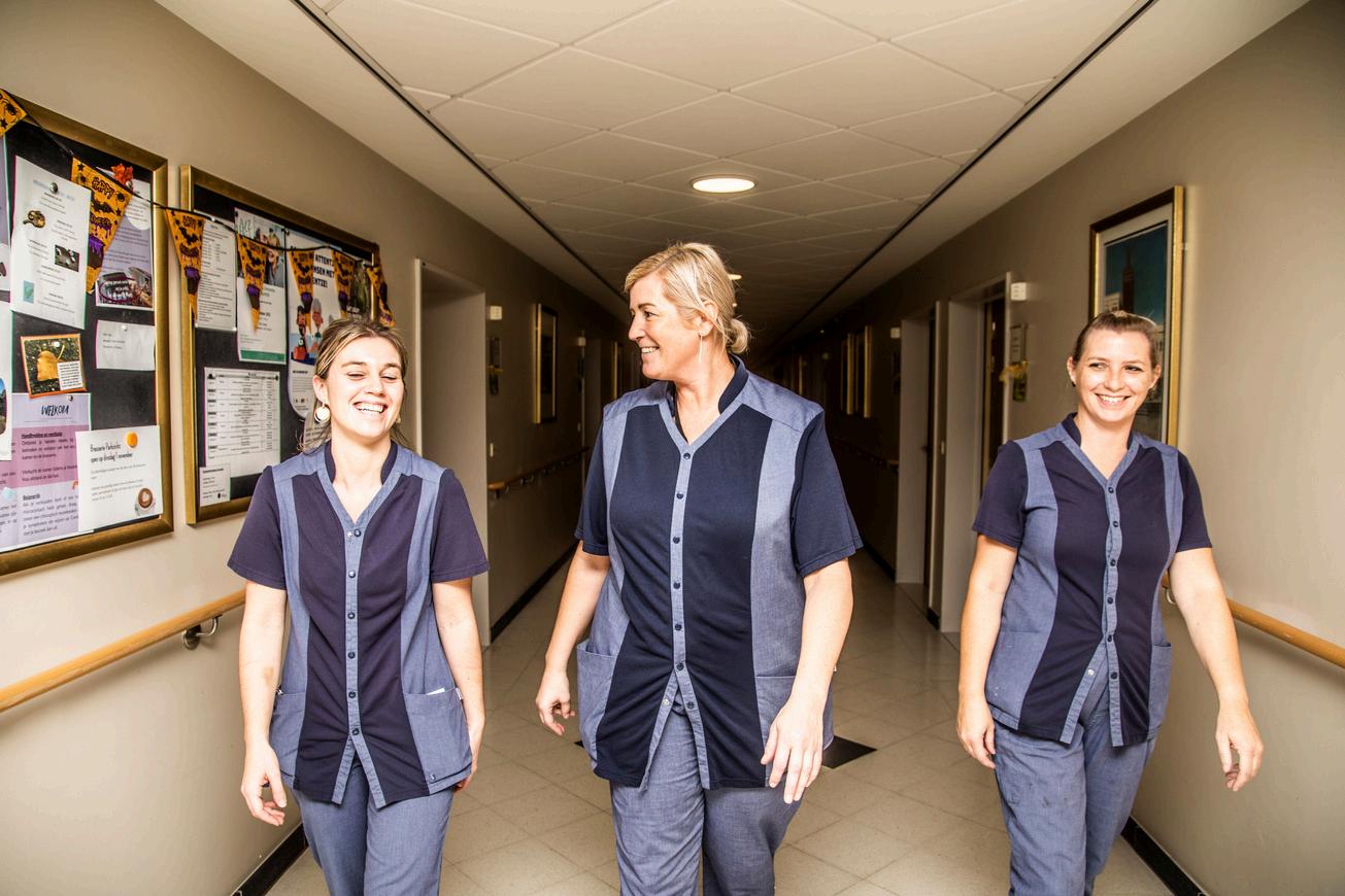 Onze teams zijn interdisciplinair samengesteld: de zorg- en verpleegkundigen werken samen met de kinesitherapeuten, ergotherapeuten, begeleiders wonen en leven en de logistieke medewerkers Ook de medewerkers van de schoonmaak en de keuken, de sociale dienst, directie en staf, pastor, psychologe, ... staan klaar voor de bewoner en de teams. Onze visie realiseren is namelijk niet haalbaar zonder een goede samenwerking. Elke medewerker is ongeacht zijn of haar functie onmisbaar om onze mooie doelstelling te behalen
