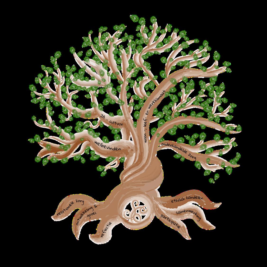 We stellen onze visie graag voor als een boom waarvan de takken onze 4 pijlers symboliseren: het welbevinden, de ja-cultuur, het aangename woon-, leef- en werkklimaat en de onderhandelde zorg. De takken zijn drager van tal van initiatieven en projecten die de bewoner, zijn omgeving en de medewerker ten goede komen. De wortels van de boom houden onze fundamenten stevig vast. Dat zijn de relationele zorg, de ontwikkeling en groei, reflectie, participatie, samenwerking en het ethisch handelen De stam en de takken van de boom geven ons vervolgens de nodige flexibiliteit om te groeien en te bloeien in diverse omstandigheden.