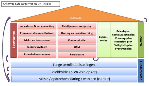 Het kwaliteitshuis is een betrouwbaar fundament dat structuur en houvast biedt voor de verschillende stappen binnen ons kwaliteitssysteem. Het zorgt voor samenhang en afstemming tussen alle elementen. Onze verbetercyclus en beleidscyclus ondersteunen de systematiek die in het kwaliteitshuis is opgenomen.