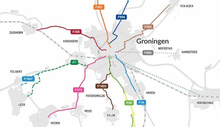 Vanuit Bedum, Roden, Ten Boer, Zuidhorn en ook Winsum kunnen forenzen en scholieren vlot en veilig over brede fietspaden naar de stad fietsen. Daarmee is ongeveer de helft van het netwerk aan doorfietsroutes (aangeduid met een F) gereed. Aan de routes vanuit Leek en Zuidlaren wordt nu gewerkt. De route Assen – Groningen is al deels in gebruik.