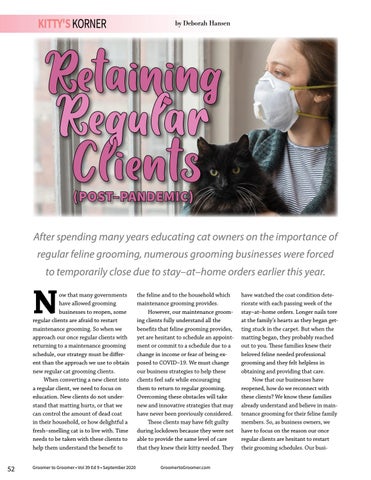 the feline and to the household which maintenance grooming provides. However, our maintenance grooming clients fully understand all the benefits that feline grooming provides, yet are hesitant to schedule an appointment or commit to a schedule due to a change in income or fear of being exposed to COVID–19. We must change our business strategies to help these clients feel safe while encouraging them to return to regular grooming. Overcoming these obstacles will take new and innovative strategies that may have never been previously considered. These clients may have felt guilty during lockdown because they were not able to provide the same level of care that they knew their kitty needed. They GroomertoGroomer.com
