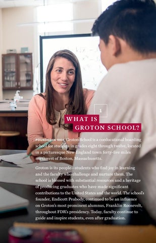 school for students in grades eight through twelve, located in a picturesque New England town forty-five miles northwest of Boston, Massachusetts. Groton is its people—students who find joy in learning and the faculty who challenge and nurture them. The school is blessed with substantial resources and a heritage of producing graduates who have made significant contributions to the United States and the world. The school’s founder, Endicott Peabody, continued to be an influence on Groton’s most prominent alumnus, Franklin Roosevelt, throughout FDR’s presidency. Today, faculty continue to guide and inspire students, even after graduation. 1