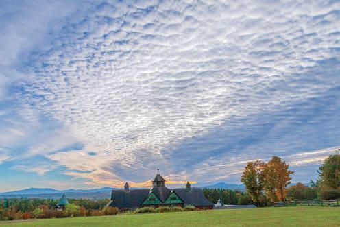 Clockwise from top left: July 2019 Climate Resiliency Fellowship; Marshall’s memorial service in the farm’s Breeding Barn; Shelburne Farms at sunrise.