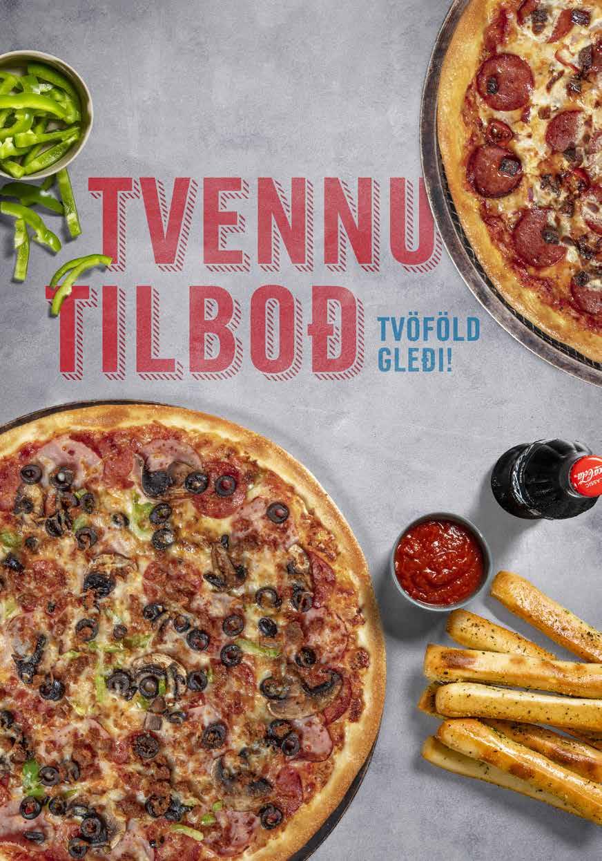 Þú sækir pizzu og stóran skammt af brauðstöngum og færð aðra pizzu sömu stærðar að auki.