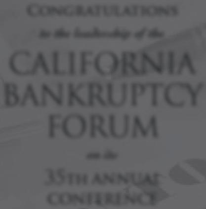 The Los Angeles Bankruptcy Forum congratulates THE CBF BOARD on the occasion of the California Bankruptcy Forum’s 35th Annual Conference. We applaud the continuing efforts of the California Bankruptcy Forum to produce a high-quality educational program at its annual conference and its commitment to diversity and inclusion.We thank CBF for supporting the Hon. Richard NeiterSummer Bankruptcy Fellowship and Externship Fund and the students who will benefit from this year’s pro bono project.