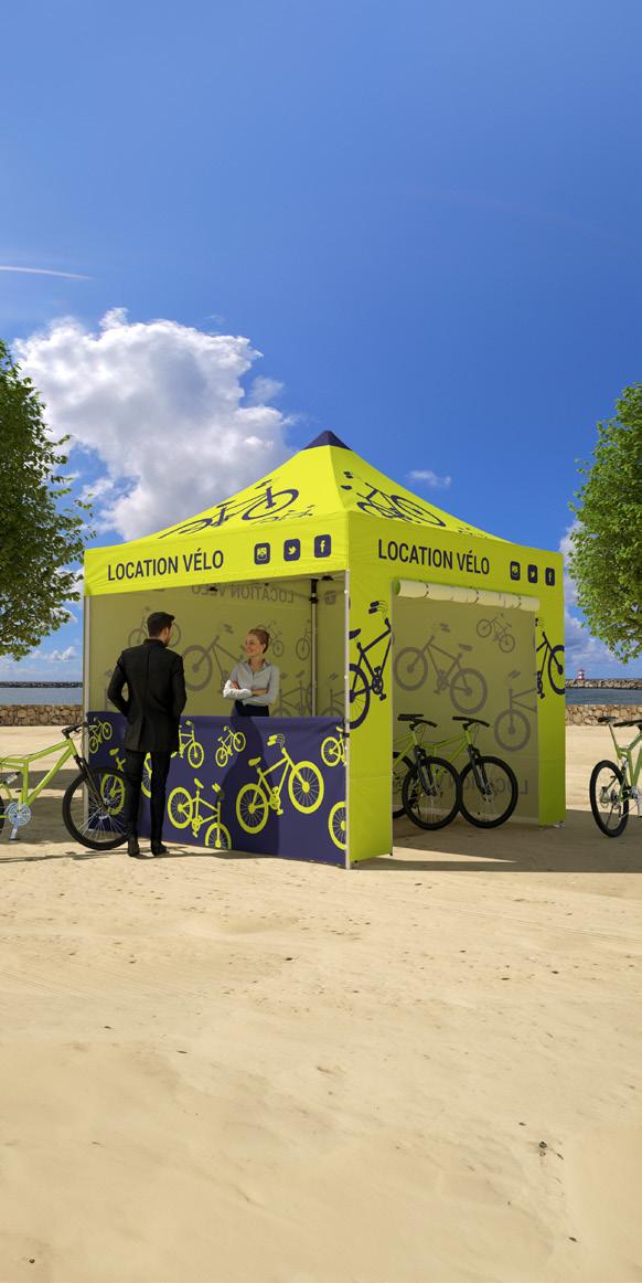 Tente 3x3m dépliante en aluminium. Ce barnum est particulièrement robuste. Sa structure est composée d'une armature hexagonale grise en aluminium de diamètre 40mm et d'épaisseur 1,2mm. Elle est personnalisée sur le toit et sur les portes en impression quadri numérique. Le toit et les portes de cette tonnelle sont en polyester avec enduction pour garantir l'impérméabilité et sont montés par velcro sur la tente. La tente est livrée prête à monter dans un trolley de transport à roulettes.
