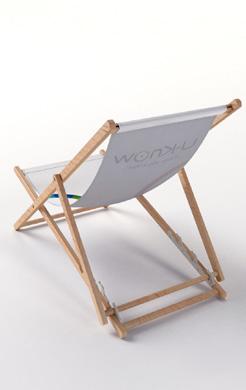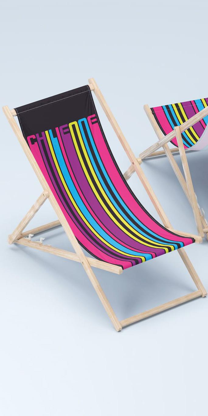 Chaise longue personnalisée confortable en hêtre massif. La toile polyester imprimée en sublimation numérique est interchangeable et lavable. La matière de la toile est déperlante.