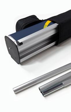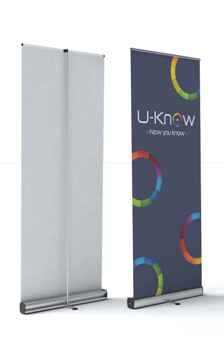 Kakémono de type rollup. Mât en métal finition aluminium avec renfort. Affiche personnalisée en bâche PVC 440g/m² norme anti-feu européenne B1. Fixation de l'affiche par double face et par clip pour changement d'affiche rapide.