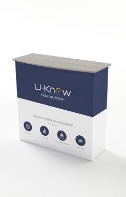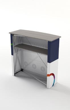 Comptoir d'accueil personnalisée en aluminium, composée de tubes carrés de diamètre 12mm et se déploie en mode parapluie en 2 secondes. La tablette supérieure est arrondie sur la face avant. La tablette se plie en son milieu pour se ranger dans le sac de transport. Une tablette intérieure est dans la même finition. Le visuel du comptoir est en polyester sublimé 210g/m² traitée anti-feu norme européenne B1. Il est fixé par un velcro de 5cm sur le contour. Le bar est livré semi-monté dans son sac de transport.
