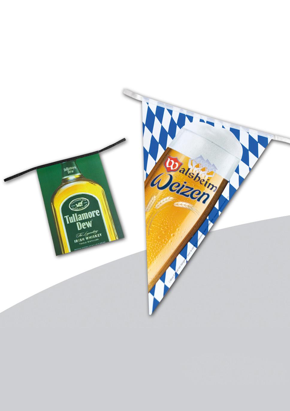 Guirlande de 3m de long composé de 10 drapeaux en polyester imprimés en quadri numérique. Possibilité d'alterner différents visuels sur les drapeaux.