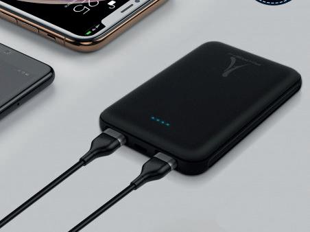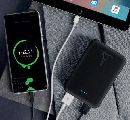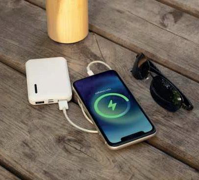 Batterie de secours ultra compacte 5000 mah 2usb x 2,1a (batterie certifiée), charge rapide. Ultra slim et toucher gomme. Packaging 100% écoconçu & recyclé. Powerbank en RABS, plastique recyclé.