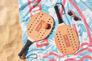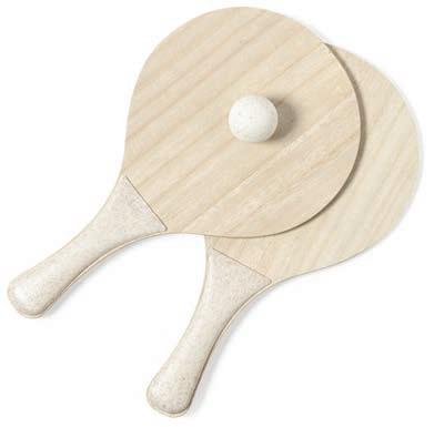 Raquettes de plage de la ligne nature. Fabriquées en bois, avec manche renforcé en canne de blé. Présentées dans un sac en grille et avec une boule de canne de blé.